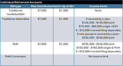 Here is a summary of contribution and income thresholds for the 2025 tax year: