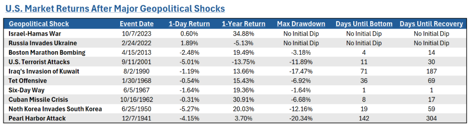 The table above highlights major geopolitical shocks dating back to the bombing of Pearl Harbor, showing the market’s 1-day and 1-year reactions, the maximum drawdown, the time it took to reach the bottom, and the time to recover to pre-conflict levels.