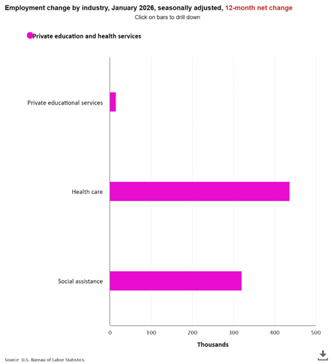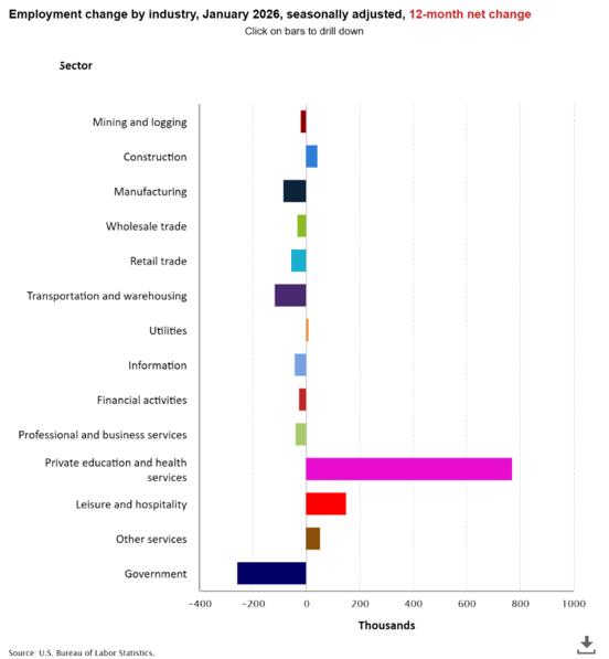 The unemployment picture is interesting. According to the Bureau of Labor Statistics, in the past year, only five industries had job gains, and the gains are dominated by healthcare, with job growth of 773k in the past year:
