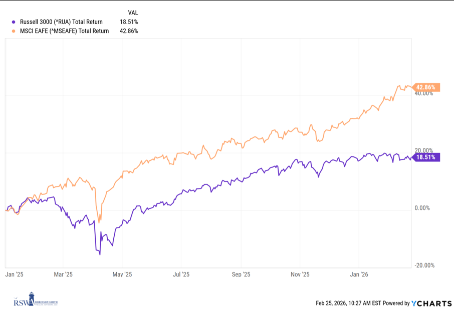 From 2010-2024, U.S. markets outperformed international developed markets in all but three years (2012, 2017, and 2022), and dramatically so. The tide started to turn at the end of 2024. In calendar year 2025, international developed markets (as measured by the EAFE) outperformed the U.S. markets (as measured by the Russell 3000) by close to 15%. During the first two months of 2026, the EAFE index has continued to outperform the Russell 3000 by approximately 8%. The big question: will this continue? Well, my crystal ball is a bit murky, but this type of divergence highlights the importance of a well-constructed, broadly diversified portfolio that has exposure globally. RSWA meets monthly to discuss any potential changes to our models and broader asset allocation decisions. It is something we will continue to monitor and watch closely.